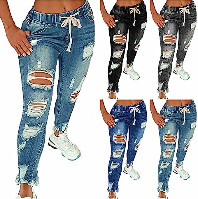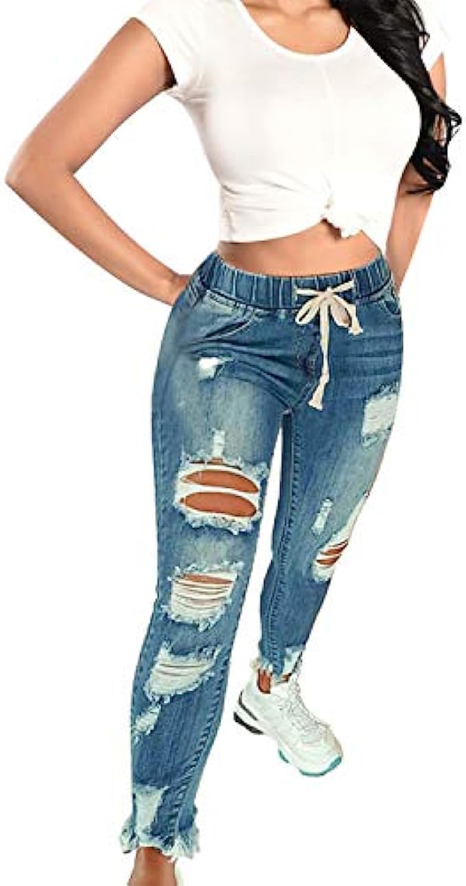 65% Cotton, 35% Polyester Cotton Elastic Denim Drawstring closure Machine Wash Material: 65% cotton, 35% polyester, soft, lightweight, elastic, breathable and durable. Features: high waisted,denim destroyed,skinny leg,zipper closure,long pants,button down classic denim,ripped detail,slim fit.
